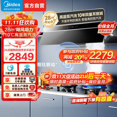 18m³大吸力,挥手感应,一键电热清洗,28叠全封电机,挡烟板角度任意调,一键电热清洗